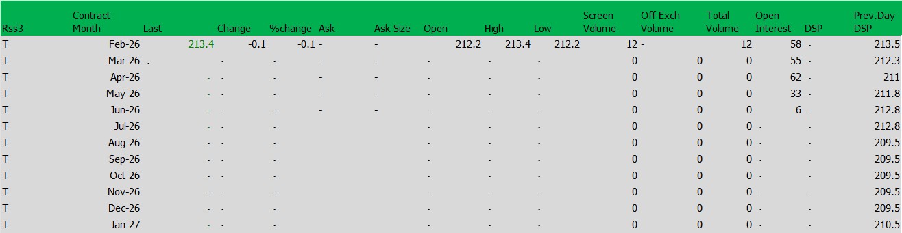 ราคายางRSS3 ตลาดยางSICOM ราคาส่งมอบเดือน ก.พ.ปิดที่213.4 เซนต์สหรัฐ ราคาลดลง -0.1 เซนต์สหรัฐหรือ คิดเป็นเปอร์เซนต์ -0.05% %