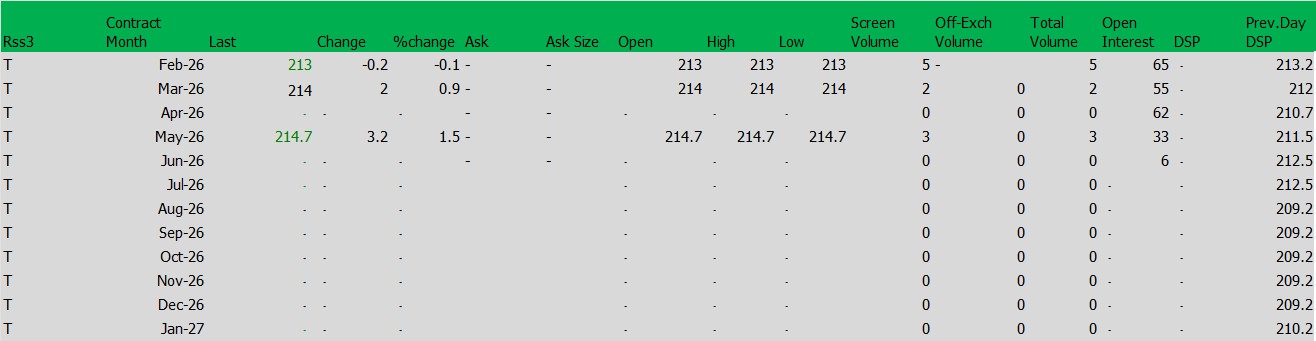 ราคาปิดตลาดยาง SICOMประจำวัน อังคาร ที่ 13มกราคม 2569 ราคายาง RSS3 ราคาเดือนก.พ. ราคาลดลง -0.2เซนต์สหรัฐ ปิดที่ 213 เซนต์สหรัฐ