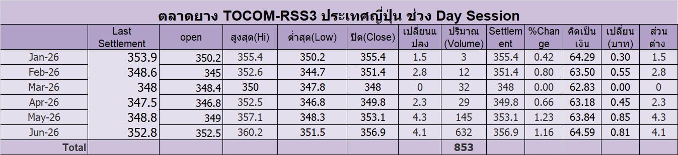 ราคาปิดตลาด TOCOM-RSS3 ช่วง Day Session ประจำวัน พุธ ที่ 14 มกราคม 2569 มิ.ย.-2026 เพิ่มขึ้น 4.1เยน Settle อยู่ที่ 356.90เยน ปริมาณ 632 สัญญา