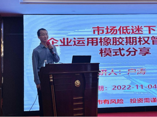 Hu Tao ผู้อำนวยการด้านการลงทุนของ Beijing Xishui Private Equity Fund Management Co., Ltd. กล่าวปาฐกถาพิเศษในหัวข้อ "Shares on the Risk Management Model of Enterprises Using Rubber Option in a Downturn in the Market" เขาอธิบายตรรกะของการจัดการความเสี่ยงด้านราคายาง วัตถุประสงค์ของการจัดการความเสี่ยงของวิสาหกิจยาง ข้อดีและข้อเสียของการใช้ตัวเลือกยาง ฯลฯ และแนะนำกลยุทธ์ทั่วไปของตัวเลือกยางแก่ผู้เข้าร่วมผ่านการอธิบายกรณีต่างๆ และในที่สุดก็ใช้ตัวเลือกสำหรับ องค์กร ประเด็นสำคัญของกลยุทธ์การบริหารความเสี่ยงได้รับคำแนะนำซึ่งเปิดแนวคิดใหม่ ๆ สำหรับองค์กรเพื่อใช้การจัดการความเสี่ยงทางเลือกได้ดีขึ้น