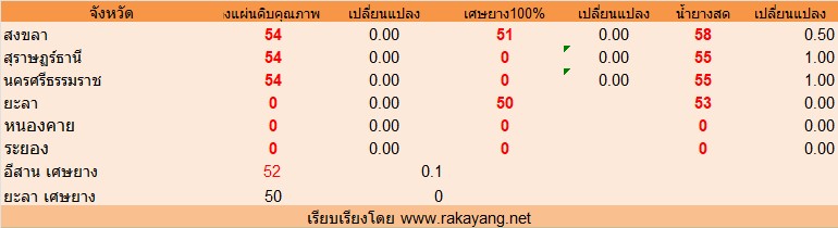 จังหวัด สงขลา ยางแผ่นดิบคุณภาพ 3 = 54บาท/กก. ราคาไม่เปลี่ยนแปลง เศษยาง 51บาท/กก. ราคาไม่เปลี่ยนแปลง บาท/กก. น้ำยางสด ราคา ณ โรงงาน 58บาท/กก. ราคาเพิ่มขึ้น 0.50บาท