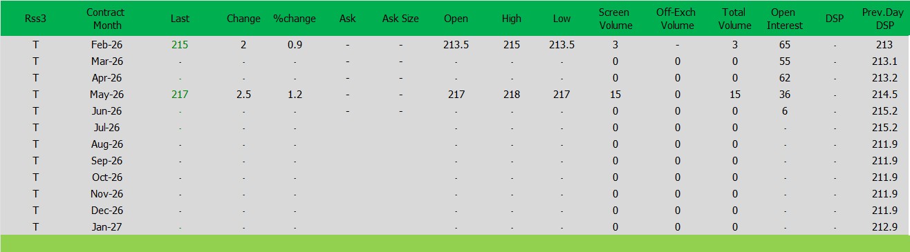 ราคาปิดตลาดยาง SICOMประจำวัน พุธ ที่ 14 มกราคม 2569 ราคายาง RSS3 ราคาเดือนก.พ. ราคาเพิ่มขึ้น 2เซนต์สหรัฐ ปิดที่ 215 เซนต์สหรัฐ