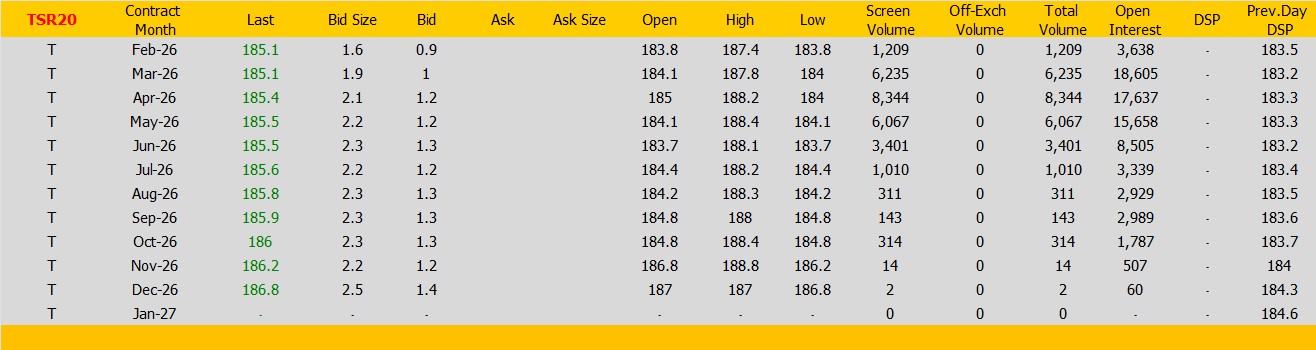 ราคายางTSR20 ตลาดยางSICOM ราคาส่งมอบเดือน ก.พ.ปิดที่185.1 เซนต์สหรัฐ ราคาเพิ่มขึ้น 1.6 เซนต์สหรัฐหรือ คิดเป็นเปอร์เซนต์ +0.87% %