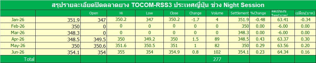 TOCOM-RSS3 ปิดตลาดช่วง Night Session ประจำวัน พฤหัสฯ ที่ 15 มกราคม 2569 ราคาเดือน มิ.ย.-2026ปิดตลาดที่ 354.90 เพิ่มขึ้น 0.8เยน ปริมาณ 102 สัญญา