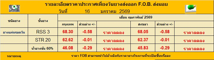 รายละเอียดราคาประกาศเที่ยงวันยางส่งออก F.O.B. ส่งมอบ ประจำวัน ศุกร์ ที่ 16 มกราคม 2569