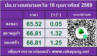 ราคาประมูลแผ่นรมควัน: ตลาดสงขลา 65.52 บาท/กก. ราคาเพิ่มขึ้น 0.05 บาท/กก. ปริมาณยาง 143,134 กก.