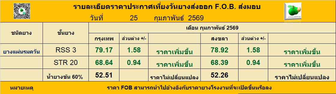 รายละเอียดราคาประกาศเที่ยงวันยางส่งออก F.O.B. ส่งมอบ ประจำวัน พุธ ที่ 25 กุมภาพันธ์ 2569