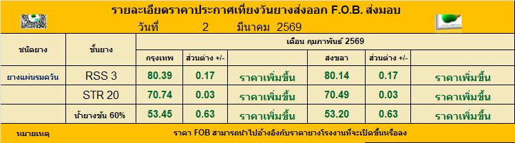 รายละเอียดราคาประกาศเที่ยงวันยางส่งออก F.O.B. ส่งมอบ ประจำวัน จันทร์ ที่ 2  มีนาคม  2569