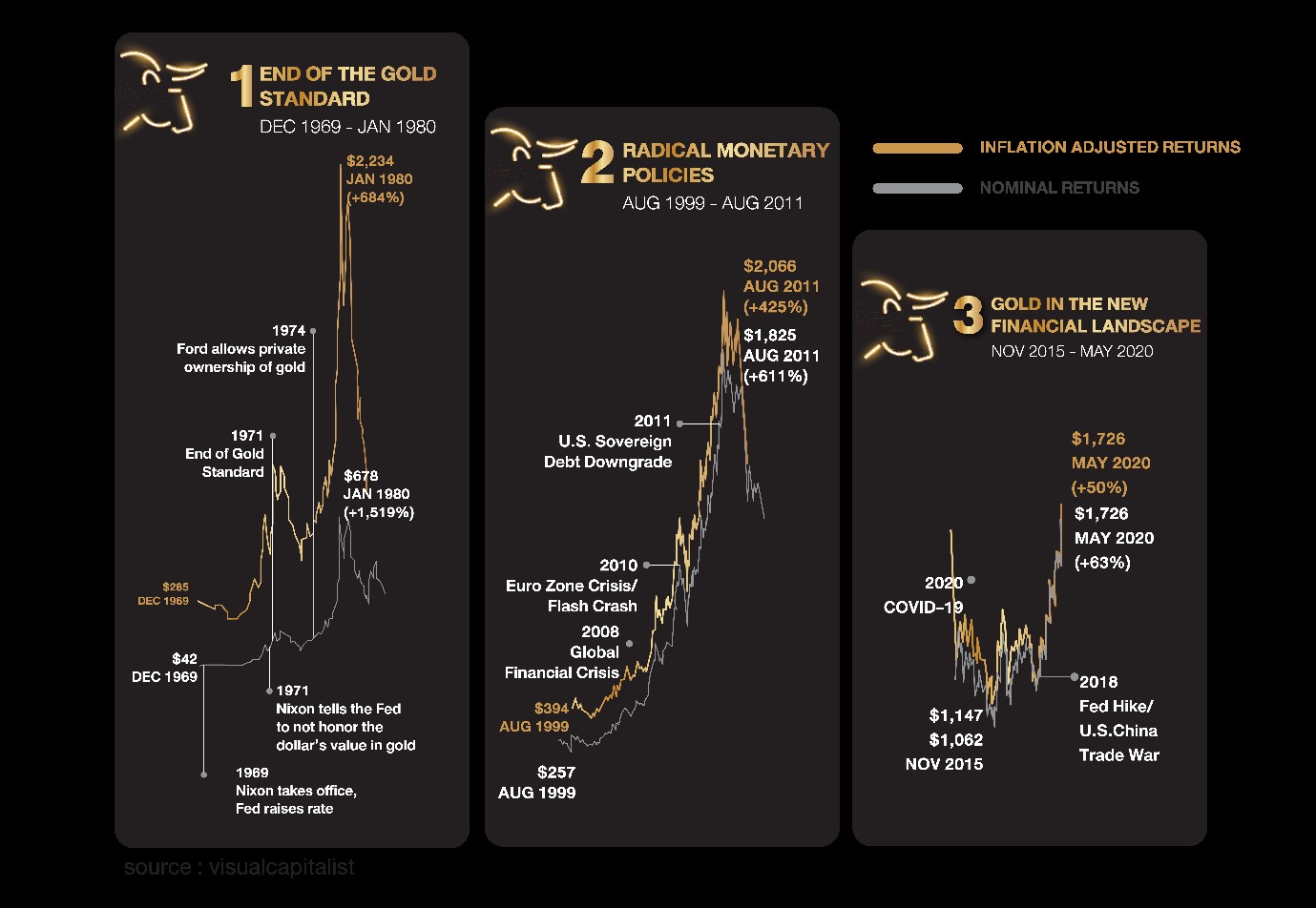 สำหรับอีกสินทรัพย์นึงที่น่าสนใจคือทองคำ ที่เหมาะกับการถือไว้เพื่อปกป้องอำนาจซื้อของเงินที่ปัจจุบันถูกลดมูลค่าลงด้วยการทำ QE ของรัฐบาลทั่วโลก ซึ่งหากความขัดแย้งระหว่าง จีน-สหรัฐยังดำเนินต่อไป การลงทุนในทองคำในช่วงเวลานี้ก็ยังเป็นช่วงเวลาที่เหมาะสม โดยหากเราแบ่ง Bull Cycle ของทองคำนั้นจะมี 3 ช่วงดังนี้
