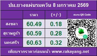 ราคาประมูลแผ่นรมควัน: ตลาดสงขลา 60.49 บาท/กก. ราคาเพิ่มขึ้น 0.18 บาท/กก. ปริมาณยาง 114,934 กก.
