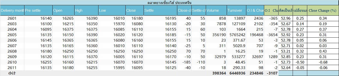 ราคาปิดตลาด(Close)ยางเซี่ยงไฮ้ประเทศจีน(SHFE)ประจำวัน พฤหัสฯ ที่ 8 มกราคม 2569ม.ค.-2026 ราคาลดลง -15หยวนปิดที่ราคา(close) 16,120 หยวน/ตัน ปริมาณ356,190 สัญญา