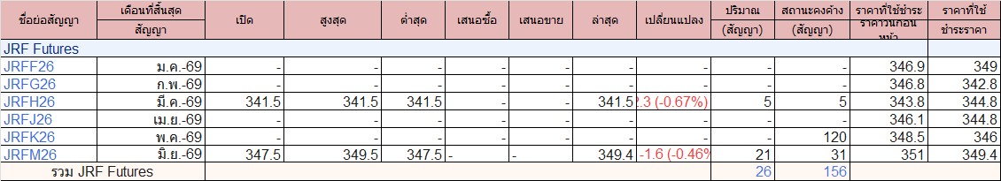 TFEX-RUBBER (JRF Futures)ประจำวัน ศุกร์ ที่ 9 มกราคม 25691 Jun 69 ลดลง -1.6 (-0.46%)ปิดที่ราคา 349.40 เยน ปริมาณการซื้อขาย 21สัญญา