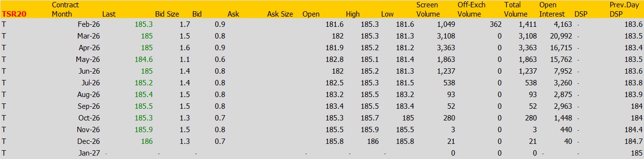 ราคายางTSR20 ตลาดยางSICOM ราคาส่งมอบเดือน ก.พ.ปิดที่185.3 เซนต์สหรัฐ ราคาเพิ่มขึ้น 1.7 เซนต์สหรัฐหรือ คิดเป็นเปอร์เซนต์ +0.93% %