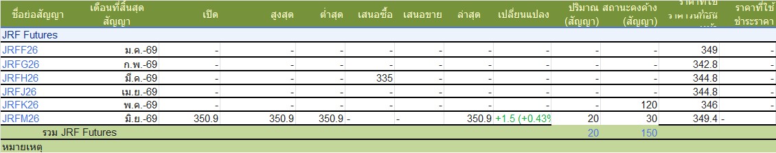 ราคาเดือนJRFM26ก.ค.66 ซึ่งเป็นเดือนตัวแทนตลาดมีปริมาณการซื้อขายทั้งสิ้น20 สัญญา