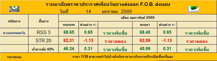 รายละเอียดราคาประกาศเที่ยงวันยางส่งออก F.O.B. ส่งมอบ ประจำวัน พุธ ที่ 14 มกราคม 2569