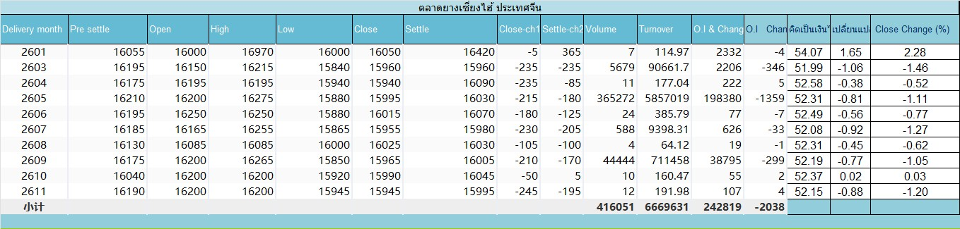 ส่วนราคา settle ของยางเซี่ยงไฮ้ SHFE เดือนส่งมอบม.ค.-26 อยู่ที่ 16,030หยวน/ตัน ลดลง-180 หยวน/ตัน หรือ -1.11%