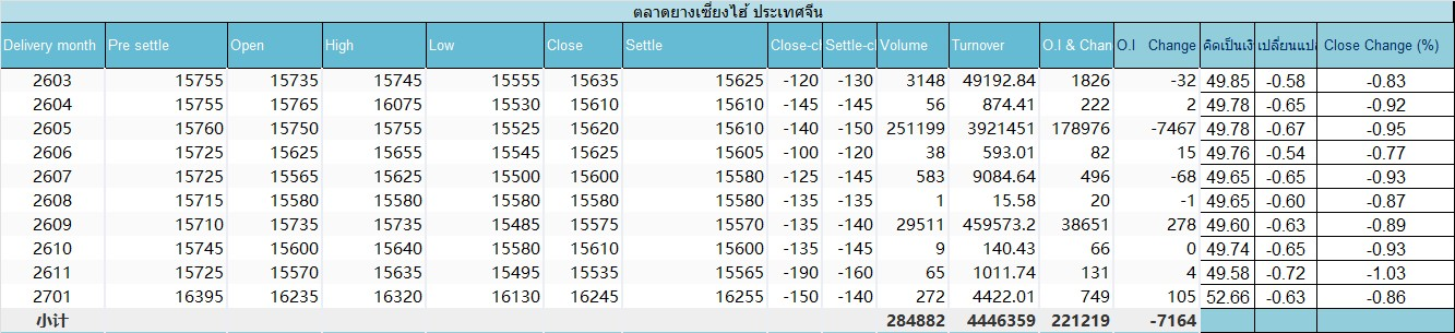 ส่วนราคา settle ของยางเซี่ยงไฮ้ SHFE เดือนส่งมอบม.ค.-26 อยู่ที่ 15,610หยวน/ตัน ลดลง-150 หยวน/ตัน หรือ -0.95%