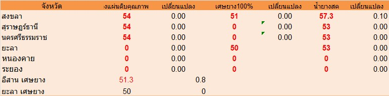 จังหวัด สงขลา ยางแผ่นดิบคุณภาพ 3 = 54บาท/กก. ราคาไม่เปลี่ยนแปลง เศษยาง 51บาท/กก. ราคาไม่เปลี่ยนแปลง บาท/กก. น้ำยางสด ราคา ณ โรงงาน 57.3บาท/กก. ราคาเพิ่มขึ้น 0.10บาท