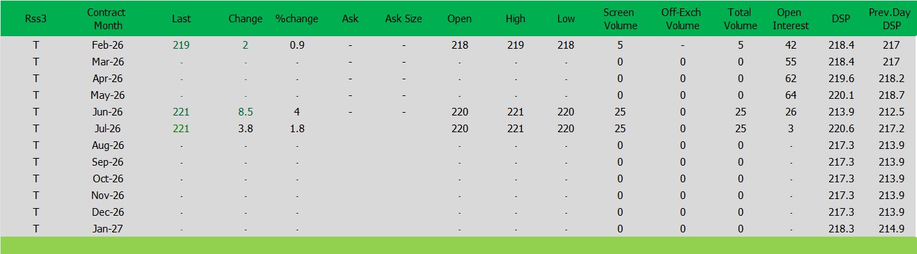 ราคาปิดตลาดยาง SICOMประจำวัน พฤหัสฯ ที่ 29มกราคม2569ราคายาง RSS3 ราคาเดือนก.พ. ราคาเพิ่มขึ้น 2เซนต์สหรัฐ ปิดที่ 219 เซนต์สหรัฐ