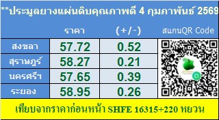 น้ำยางหาดใหญ่ 58.80 บาทราคาไม่เปลี่ยนแปลง