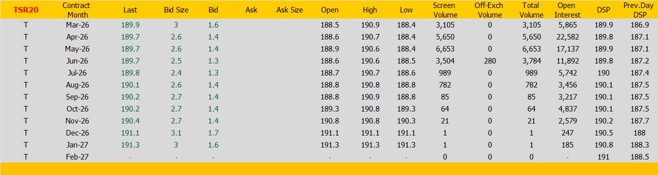 ราคายางTSR20 ตลาดยางSICOM ราคาส่งมอบเดือน มี.ค.ปิดที่189.9 เซนต์สหรัฐ ราคาเพิ่มขึ้น 3 เซนต์สหรัฐหรือ คิดเป็นเปอร์เซนต์ +1.61% %