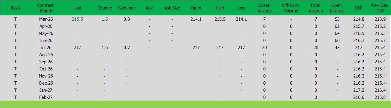 ราคาปิดตลาดยาง SICOMประจำวัน พุธ ที่ 4กุมภาพันธ์2569ราคายาง RSS3 ราคาเดือนมี.ค. ราคาเพิ่มขึ้น 1.6เซนต์สหรัฐ ปิดที่ 215.5 เซนต์สหรัฐ
