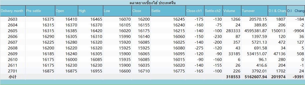 ราคาปิดตลาด(Close)ยางเซี่ยงไฮ้ประเทศจีน(SHFE)ประจำวัน พฤหัสฯ ที่ 5 กุมภาพันธ์ 2569ม.ค.-2026 ราคาลดลง -140หยวนปิดที่ราคา(close) 16,175 หยวน/ตัน ปริมาณ283,333 สัญญา