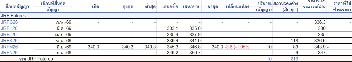 TFEX-RUBBER (JRF Futures)ประจำวัน พฤหัสฯ ที่ 5 กุมภาพันธ์ 25691 Jun 69 ลดลง -3.6 (-1.05%)ปิดที่ราคา 340.30 เยน ปริมาณการซื้อขาย 10สัญญา
