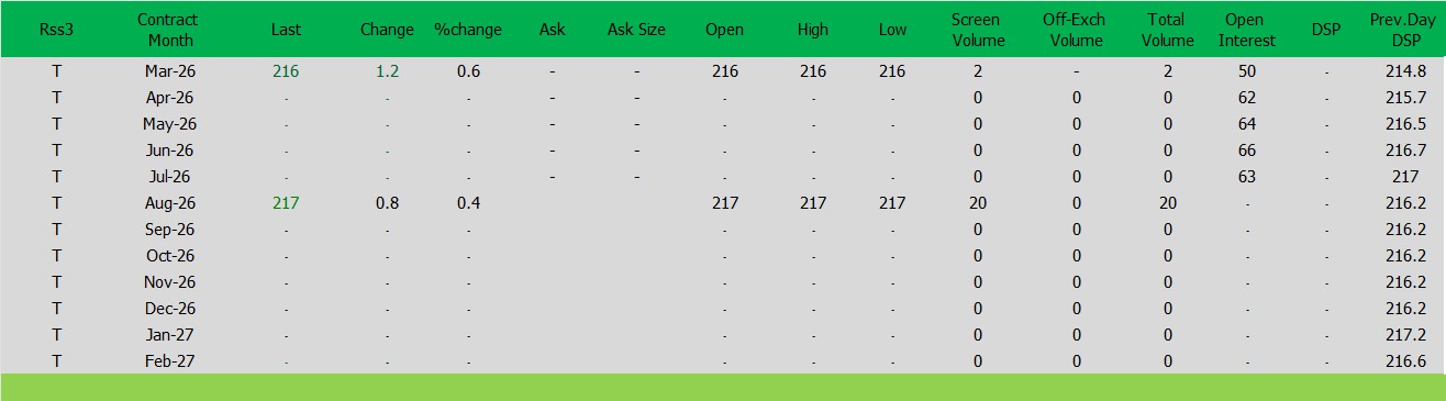 ราคาปิดตลาดยาง SICOMประจำวัน พฤหัสฯ ที่ 5กุมภาพันธ์2569ราคายาง RSS3 ราคาเดือนมี.ค. ราคาเพิ่มขึ้น 1.2เซนต์สหรัฐ ปิดที่ 216 เซนต์สหรัฐ
