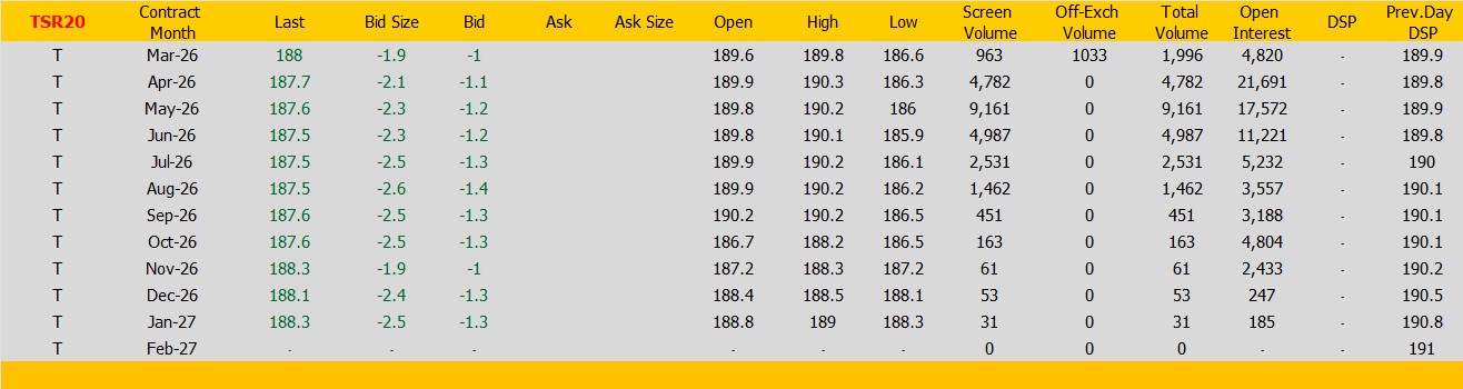 ลงไปต่ำสุด 186.6 เซนต์สหรัฐ ราคาต่ำสุดลดลง -3.3 เซนต์สหรัฐ