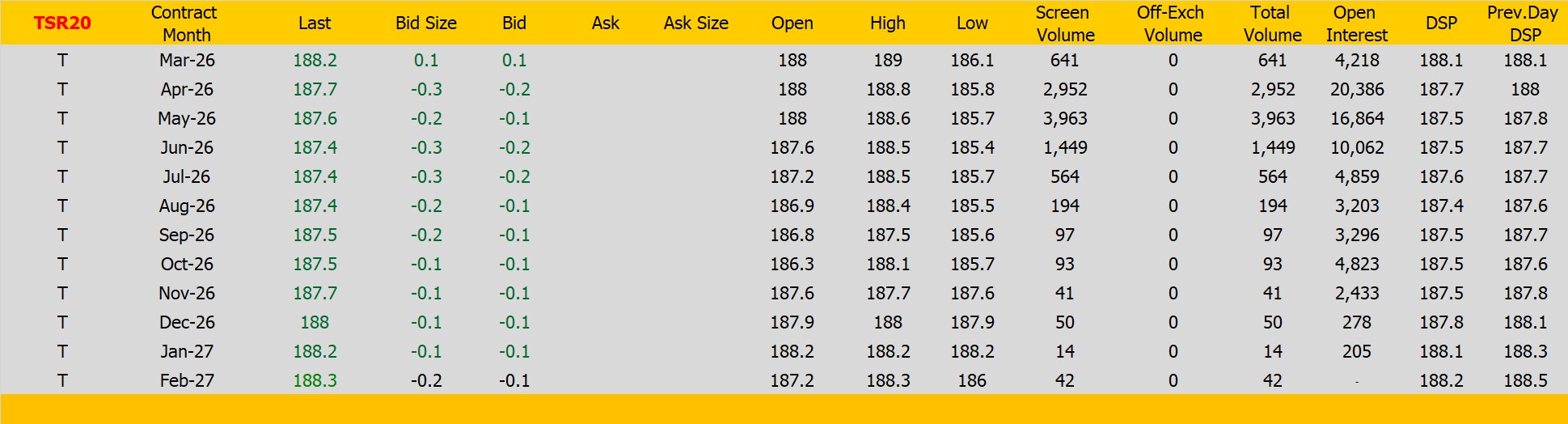ราคายางTSR20 ตลาดยางSICOM ราคาส่งมอบเดือน มี.ค.ปิดที่188.2 เซนต์สหรัฐ ราคาเพิ่มขึ้น 0.1 เซนต์สหรัฐหรือ คิดเป็นเปอร์เซนต์ +0.05% %