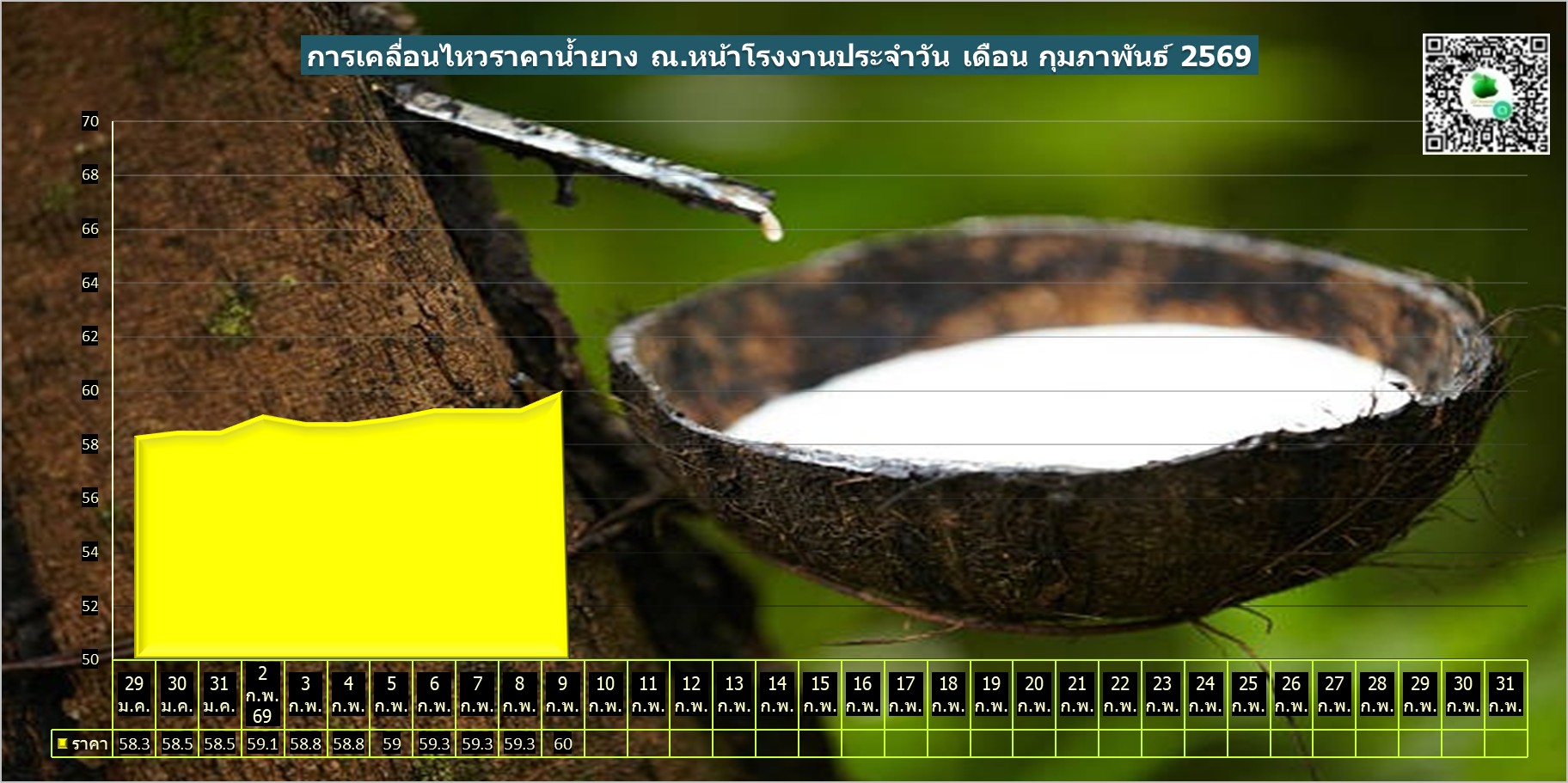 สรุปราคาน้ำยางโรงงานและลานท้องถิ่นทั่วไปประจำวัน จันทร์ ที่ 9 กุมภาพันธ์ 2569