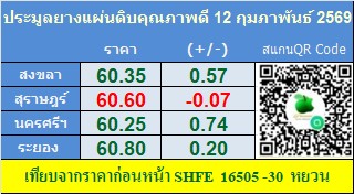 ราคาประมูลแผ่นดิบ : ตลาดสงขลา 60.35 บาท/กก. ราคาเพิ่มขึ้น 0.57บาท/กก. ปริมาณยาง 1,817 กก.