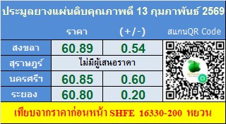 ราคาประมูลแผ่นดิบ : ตลาดสงขลา 60.89 บาท/กก. ราคาเพิ่มขึ้น 0.54บาท/กก. ปริมาณยาง 20,772 กก.