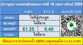 น้ำยางหาดใหญ่ 63.80 บาท ราคาเพิ่มขึ้น 1.50 บาท