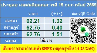ราคาประมูลแผ่นดิบ : ตลาดสงขลา 62.21 บาท/กก. ราคาเพิ่มขึ้น 1.32บาท/กก. ปริมาณยาง 1,490 กก.