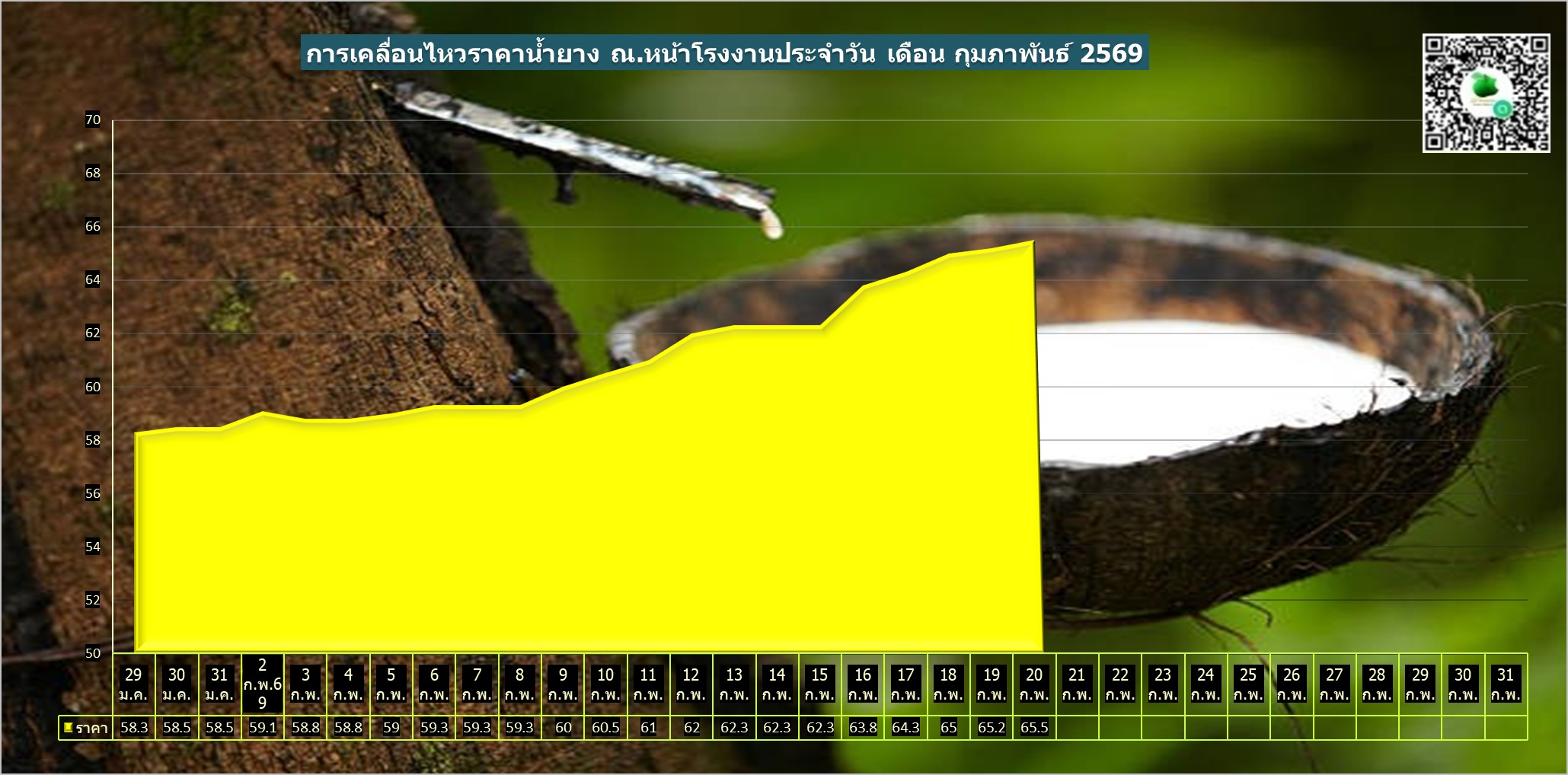 สรุปราคาน้ำยางโรงงานและลานท้องถิ่นทั่วไปประจำวัน ศุกร์ ที่ 20 กุมภาพันธ์ 2569