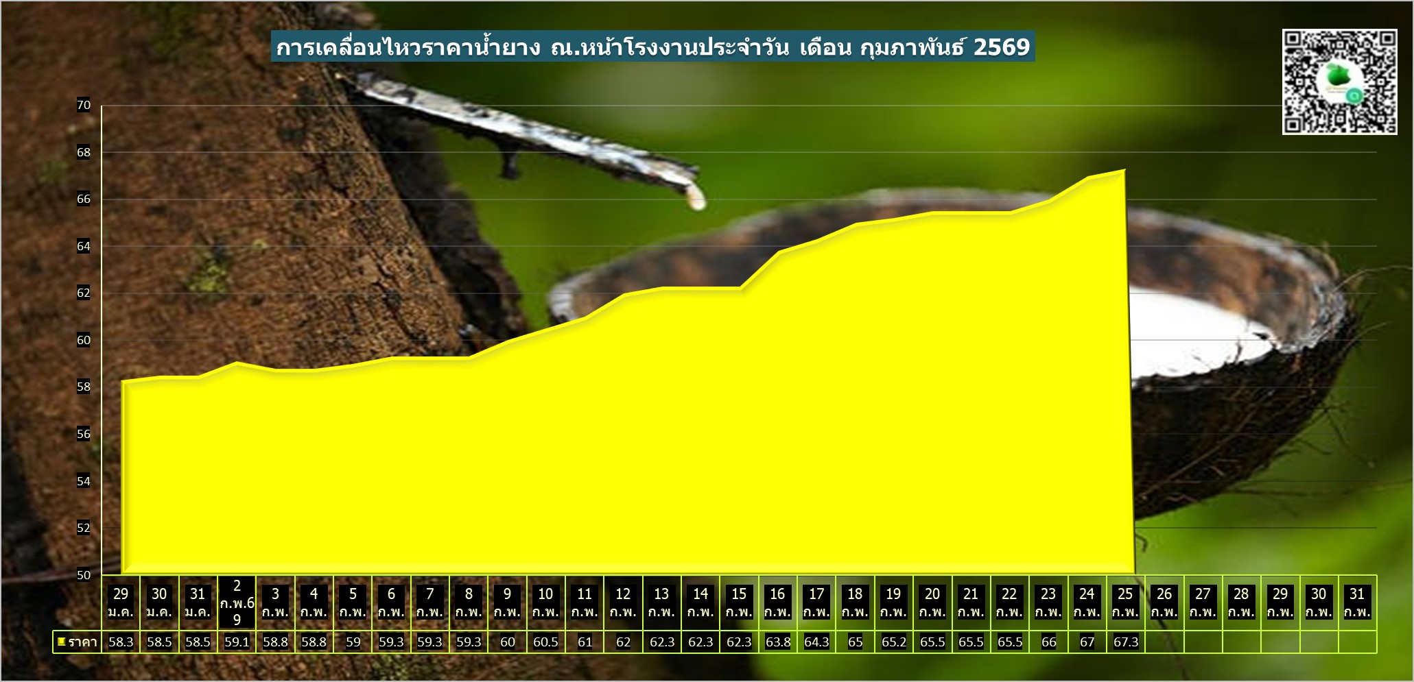 สรุปราคาน้ำยางโรงงานและลานท้องถิ่นทั่วไปประจำวัน พุธ ที่ 25 กุมภาพันธ์ 2569