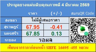 น้ำยางหาดใหญ่ 69.00 บาท ราคาเพิ่มขึ้น 0.20 บาท
