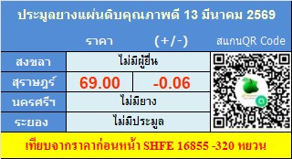 ตลาดกลางประมูลยางสุราษฯ69.00 บาท/กก. ราคาลดลง -0.06บาท/กก. ผู้ชนะประมูล 0.00 ปริมาณยาง 1,100 กก.