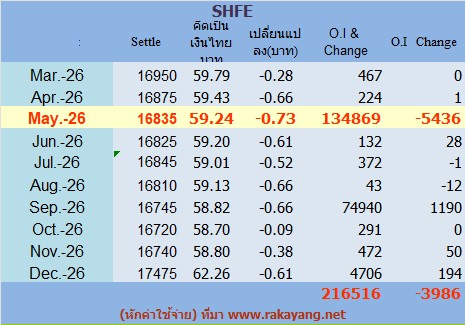 เทียบจากราคา(Settle)คิดเป็นเงินไทย(หักค่าใช้จ่าย)59.24บาท/กก. ราคาลดลง -0.73บาท/กก.