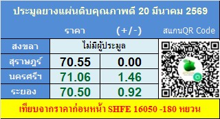 น้ำยางหาดใหญ่ 74.50 บาท ราคาเพิ่มขึ้น 0.50 บาท