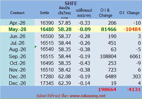 เทียบจากราคา(Settle)คิดเป็นเงินไทย(หักค่าใช้จ่าย)58.28บาท/กก. ราคาเพิ่มขึ้น -0.09บาท/กก.