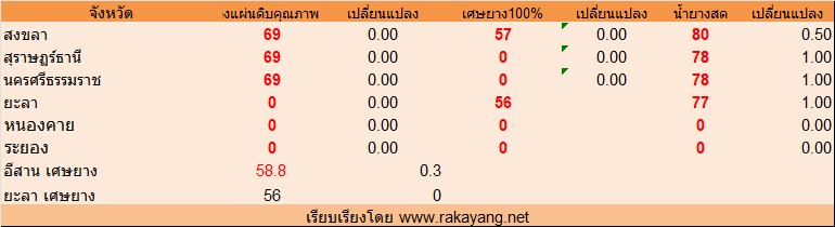 จังหวัด สงขลา ยางแผ่นดิบคุณภาพ 3 = 69บาท/กก. ราคาไม่เปลี่ยนแปลง เศษยาง 57บาท/กก. ราคาไม่เปลี่ยนแปลง บาท/กก. น้ำยางสด ราคา ณ โรงงาน 80บาท/กก. ราคาเพิ่มขึ้น 0.50บาท