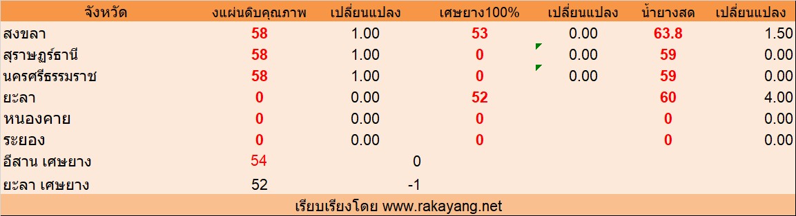 จังหวัด สงขลา ยางแผ่นดิบคุณภาพ 3 = 58บาท/กก. ราคาเพิ่มขึ้น 1.00 บาท/กก. เศษยาง 53บาท/กก. ราคาไม่เปลี่ยนแปลง บาท/กก. น้ำยางสด ราคา ณ โรงงาน 63.8บาท/กก. ราคาเพิ่มขึ้น 1.50บาท