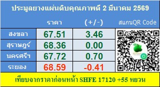 ราคาประมูลแผ่นดิบ : ตลาดสงขลา 67.51 บาท/กก. ราคาเพิ่มขึ้น 3.46บาท/กก. ปริมาณยาง 6,067 กก.
