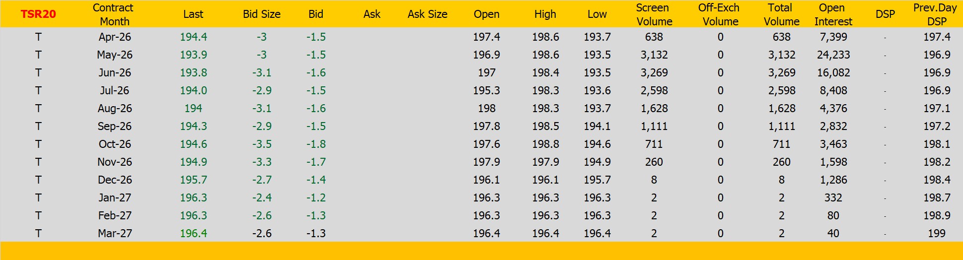 ราคายางTSR20 ตลาดยางSICOM ราคาส่งมอบเดือน มี.ค.ปิดที่194.4 เซนต์สหรัฐ ราคาลดลง -3 เซนต์สหรัฐหรือ คิดเป็นเปอร์เซนต์ -1.52% %