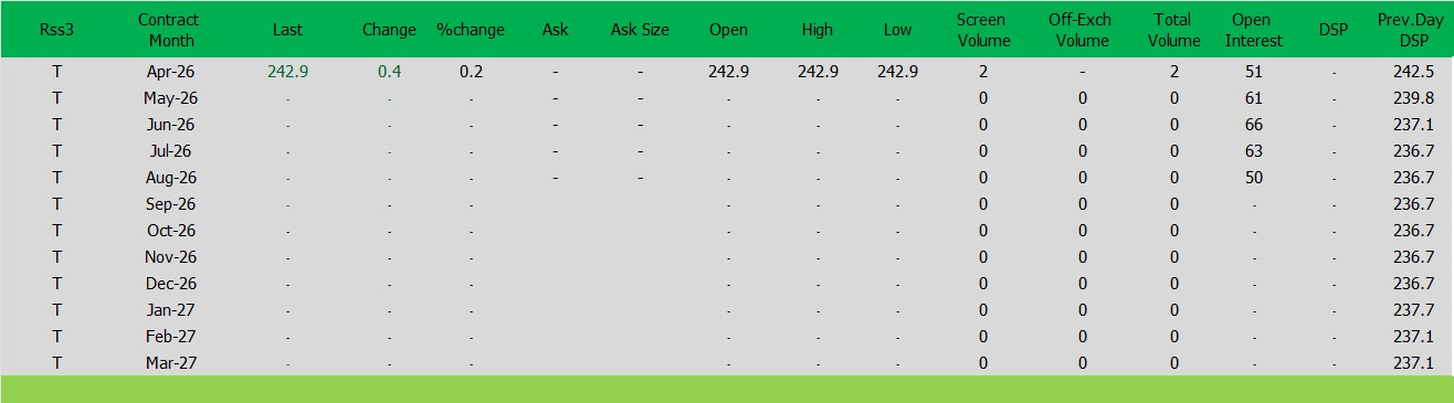 ราคาปิดตลาดยาง SICOMประจำวัน จันทร์ ที่ 9มีนาคม2569ราคายาง RSS3 ราคาเดือนเม.ย. ราคาเพิ่มขึ้น 0.4เซนต์สหรัฐ ปิดที่ 242.9 เซนต์สหรัฐ