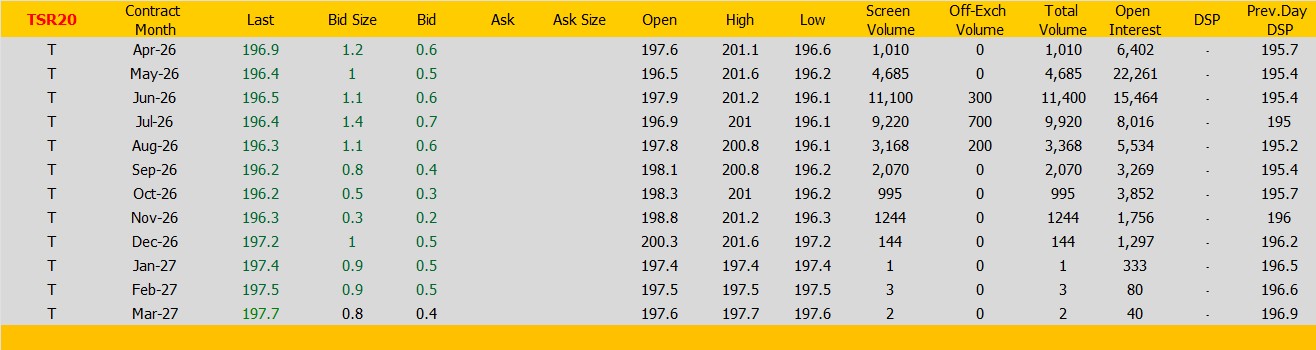 ราคายางTSR20 ตลาดยางSICOM ราคาส่งมอบเดือน เม.ย.ปิดที่196.9 เซนต์สหรัฐ ราคาเพิ่มขึ้น 1.2 เซนต์สหรัฐหรือ คิดเป็นเปอร์เซนต์ +0.61% %