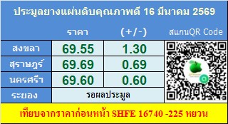 ราคาประมูลแผ่นดิบ : ตลาดสงขลา 69.55 บาท/กก. ราคาเพิ่มขึ้น 1.30บาท/กก. ปริมาณยาง 756 กก.